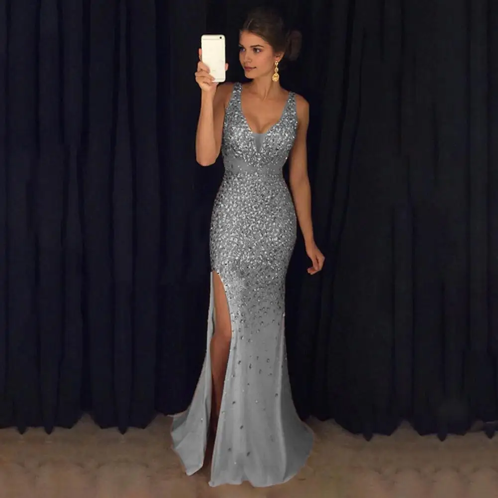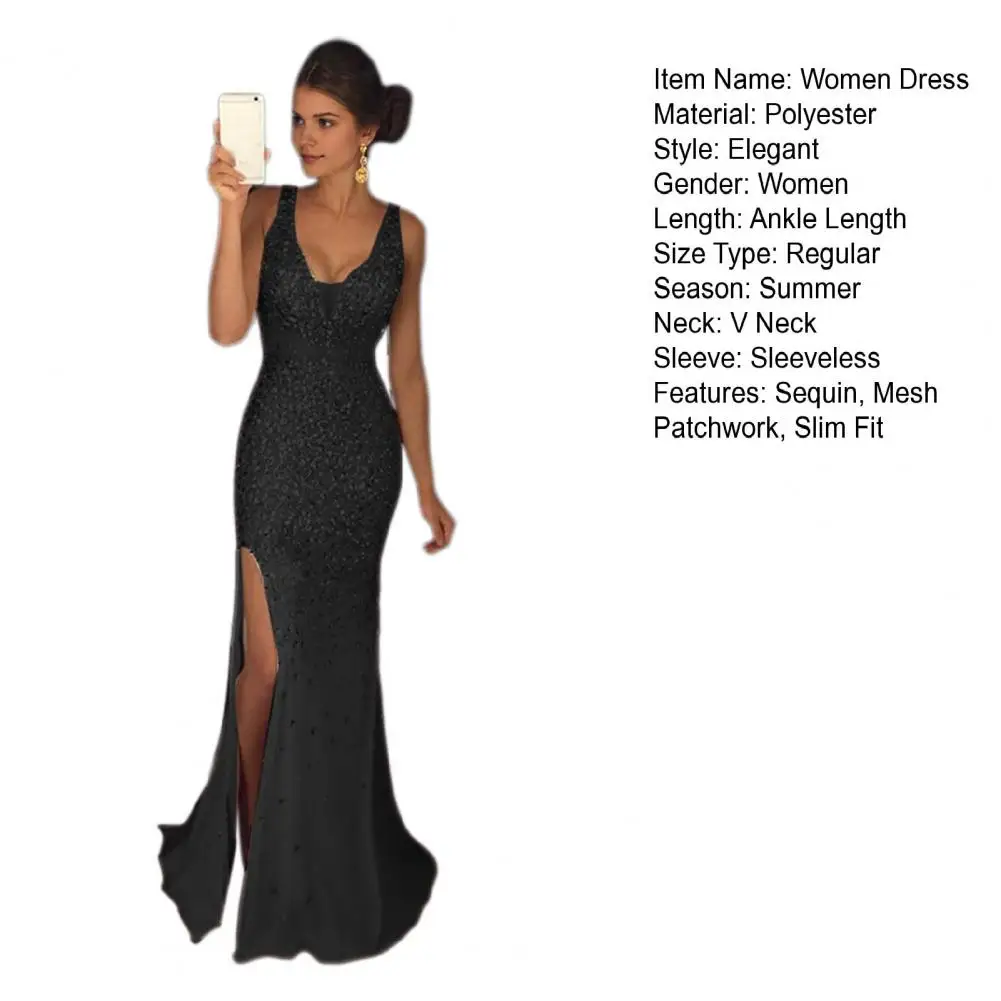 Women Evening Dress V Neck Mesh Patchwork Sequin Sleeveless Split Hem Mermaid Shape Slim Fit Prom Party Banquet Bride Maxi Dress